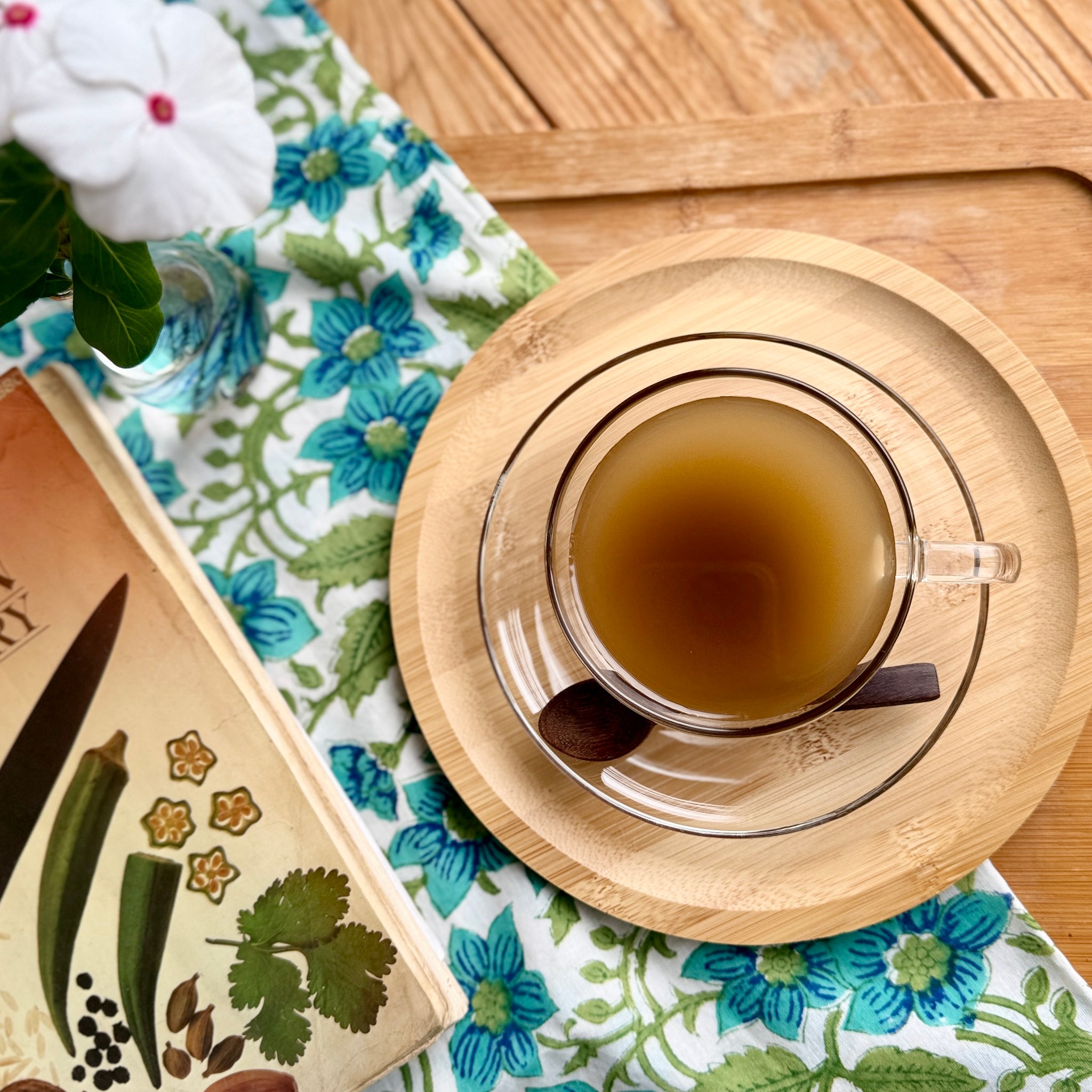 主な配合は、トゥルシー、ベルノキ、ヤコウボク、レモングラス、ショウガ、黒コショウ、コリアンダー、シナモンなど。これらのハーブは消化の火(アグニ)を高め、体内の毒素を燃焼させ、発汗を促すことで発熱の軽減を助けます。また、咳や呼吸器の詰まりに働きかけるハーブも含まれており、季節性の不調を総合的にサポートします。